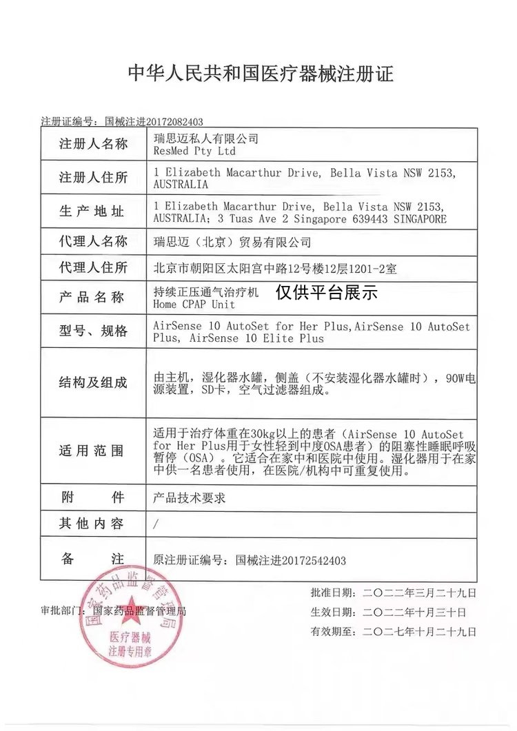 產(chǎn)品名稱 : 瑞思邁全自動(dòng)雙水平呼吸機(jī)S10